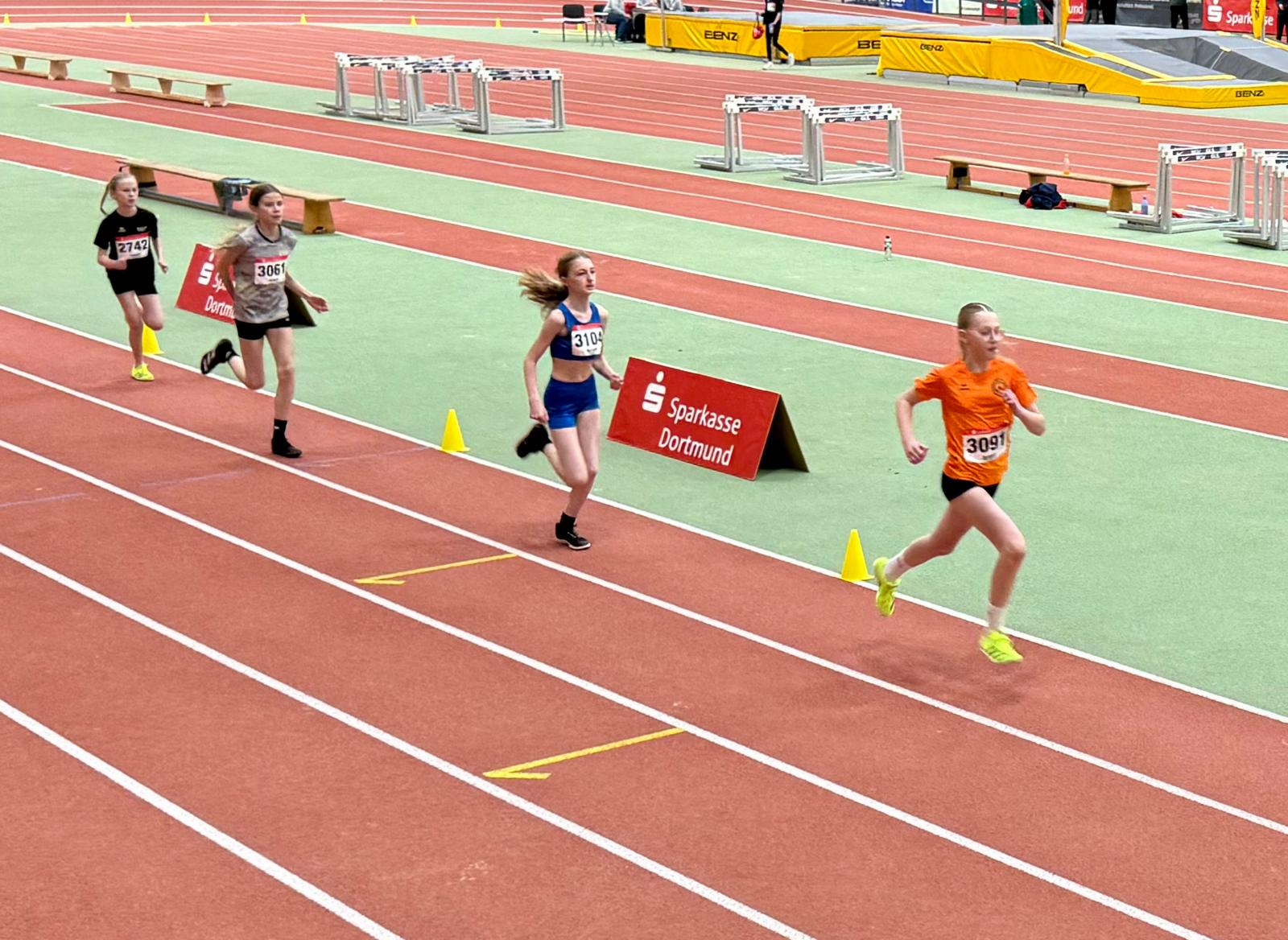 An Tag eins ging es für Chiara, Katharina und Lena gemeinsam mit Trainer Sascha nach Dortmund. Lena war gleich in drei Disziplinen am Start. Über die 60 m schrammte sie mit 8,71 Sek. nur knapp an ihrer Bestzeit vorbei, ebenso wie im Weitsprung, wo sie mit 4,62 m nur zehn Zentimeter unter ihrer persönlichen Bestleistung blieb. Über die 200 m fiel ihre Bestzeit dann jedoch und steht nun bei 29,17 Sek.